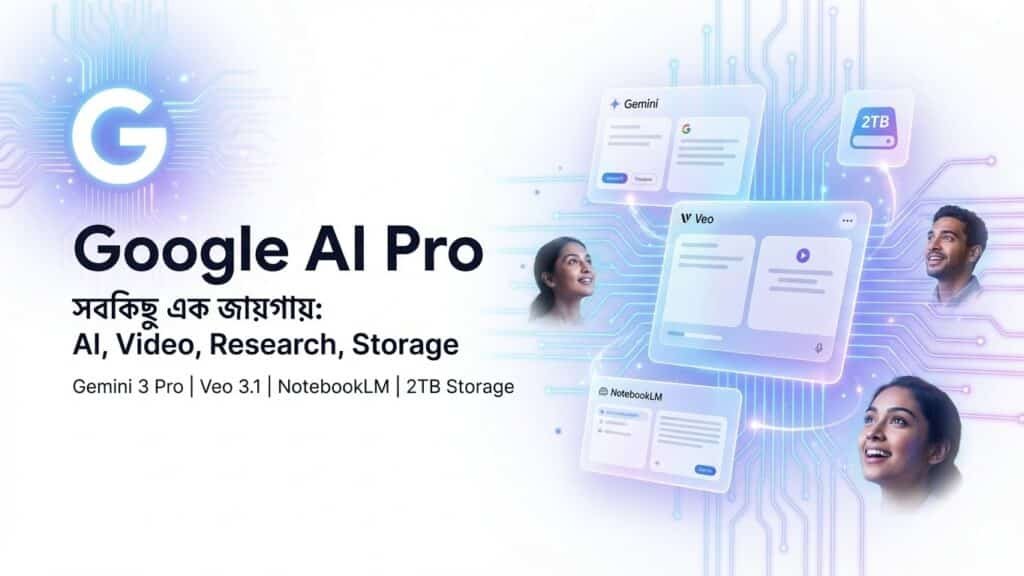 Google AI Pro 2 একটি অল-ইন-ওয়ান AI প্যাকেজ, যেখানে রয়েছে Gemini 3 Pro, Veo 3.1 Fast, AI ভিডিও ও ইমেজ টুলস, Google Workspace AI এবং 2 TB Cloud Storage – সম্পূর্ণ ১ বছরের জন্য।